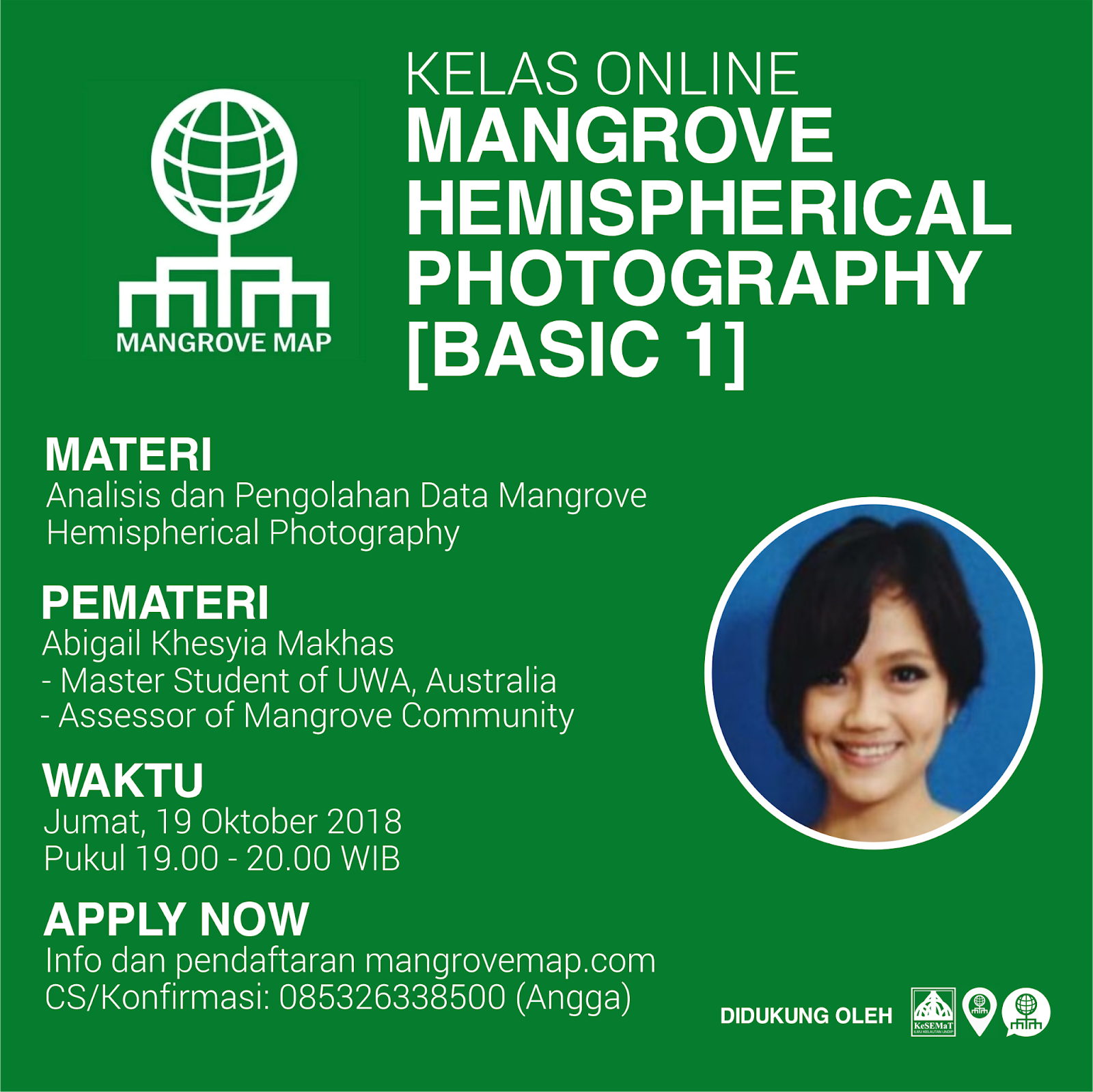 Semarang – Mangrove Map. Dengan ini, diumumkan kepada masyarakat umum bahwa Mangrove Map kembali akan mengadakan Kelas Online Lanjutan bertema Mangrove Hemispherical Photography [Basic 1] dengan sub materi Analisis dan Pengolahan Data Mangrove Hemispherical Photography. Bagi Anda yang berminat mengikuti kegiatan ini, kami persilakan untuk mencermati informasi di bawah ini:
